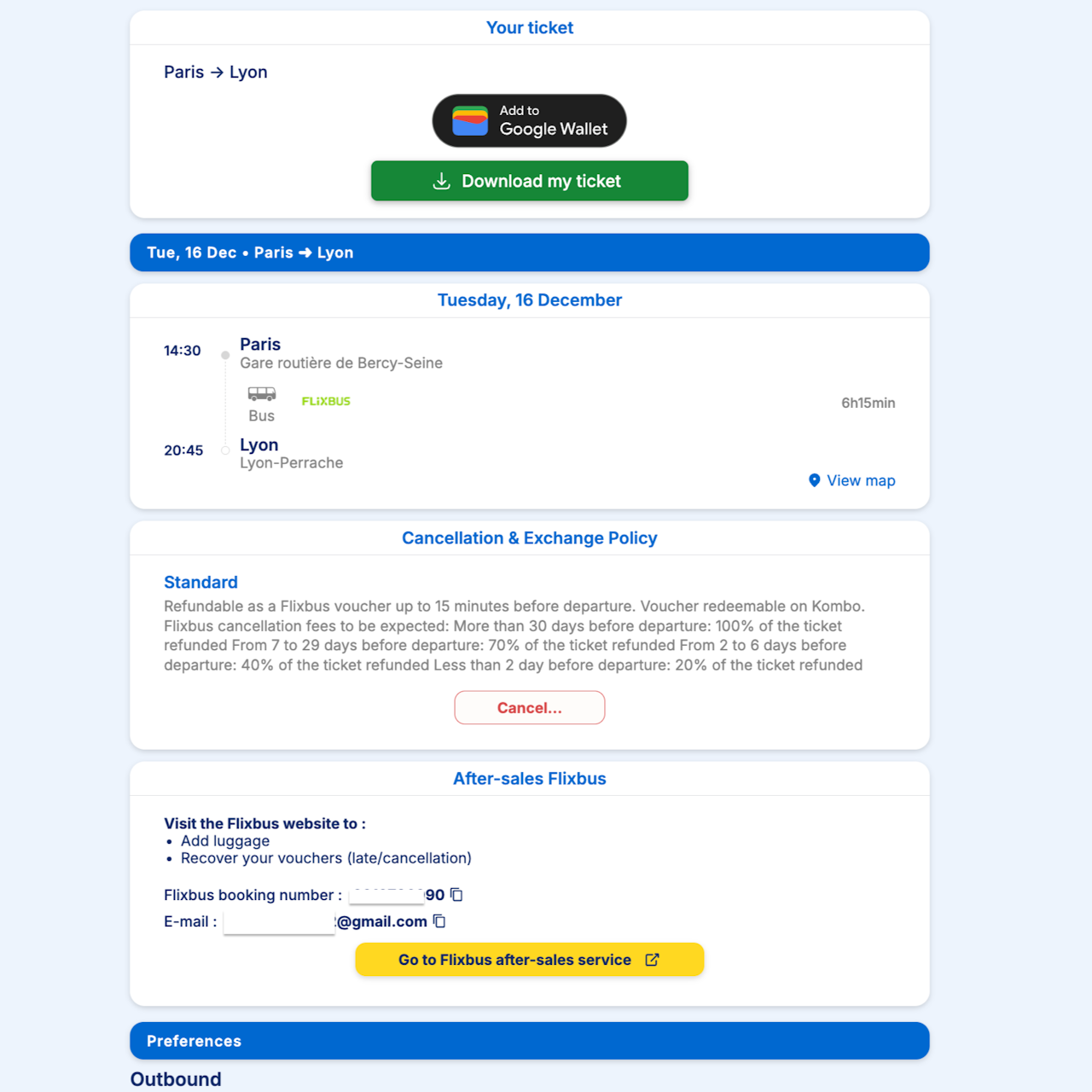 🚌 Some buses are exchangeable, such as Flixbus. To change your tickets, simply go to your after-sales area using the information we provide, then click on ‘Change departure date and time’. Please note that this depends on the conditions of your ticket and also on the company.