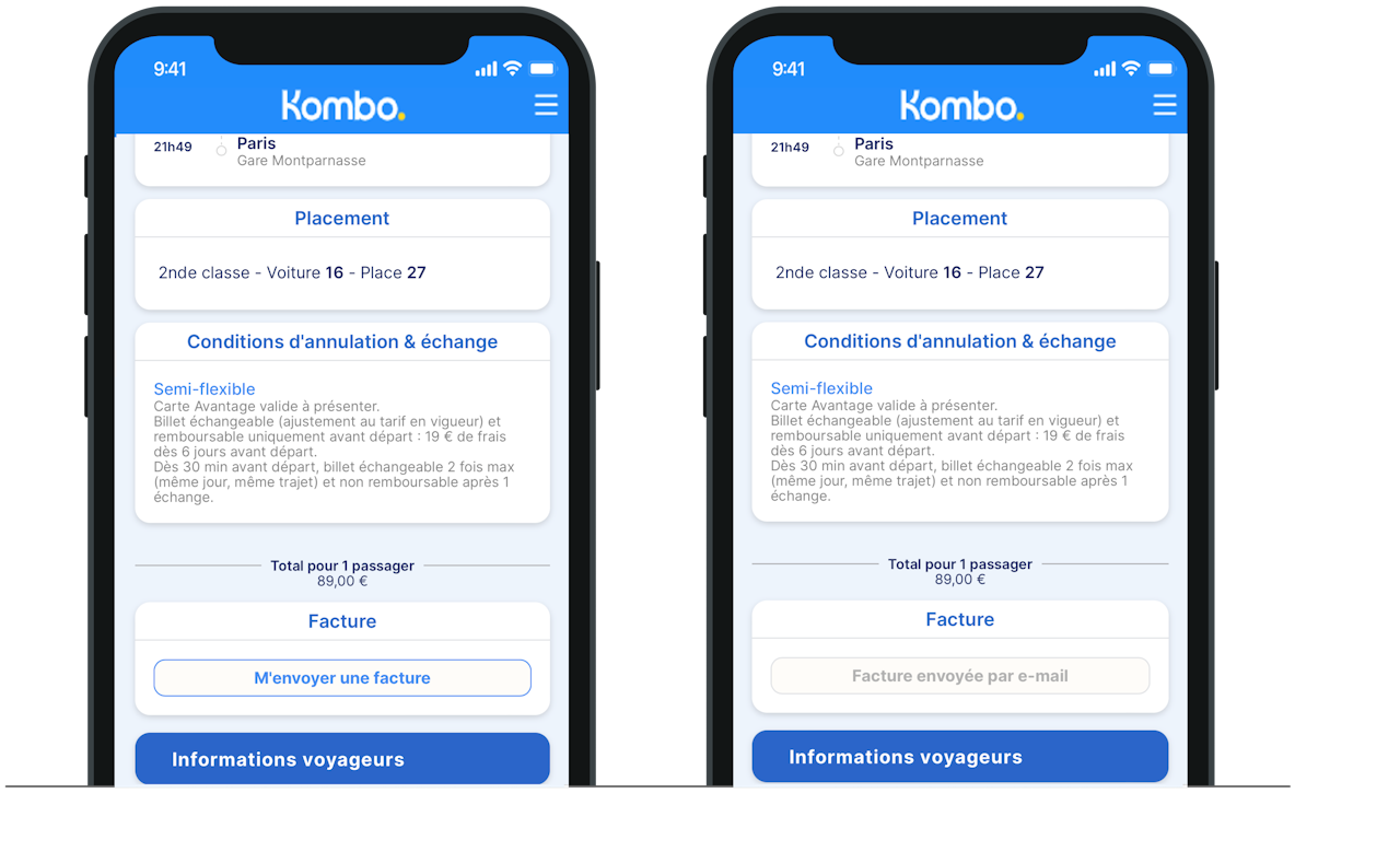 💻 All your invoices are available once you have completed your trip, directly on your after-sales area. Under the heading "passenger information", you have "send me my invoice by email".
