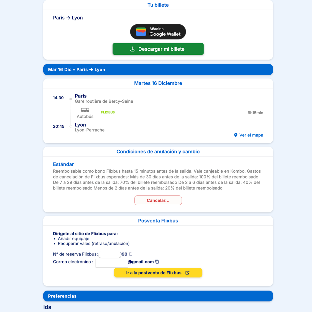🚌 Algunos autobuses son intercambiables, como Flixbus. Para cambiar tus billetes, solo tienes que ir a tu área de posventa utilizando la información que te proporcionamos y hacer clic en «Cambiar fecha y hora de salida». Ten en cuenta que esto depende de las condiciones de tu billete y también de la compañía.