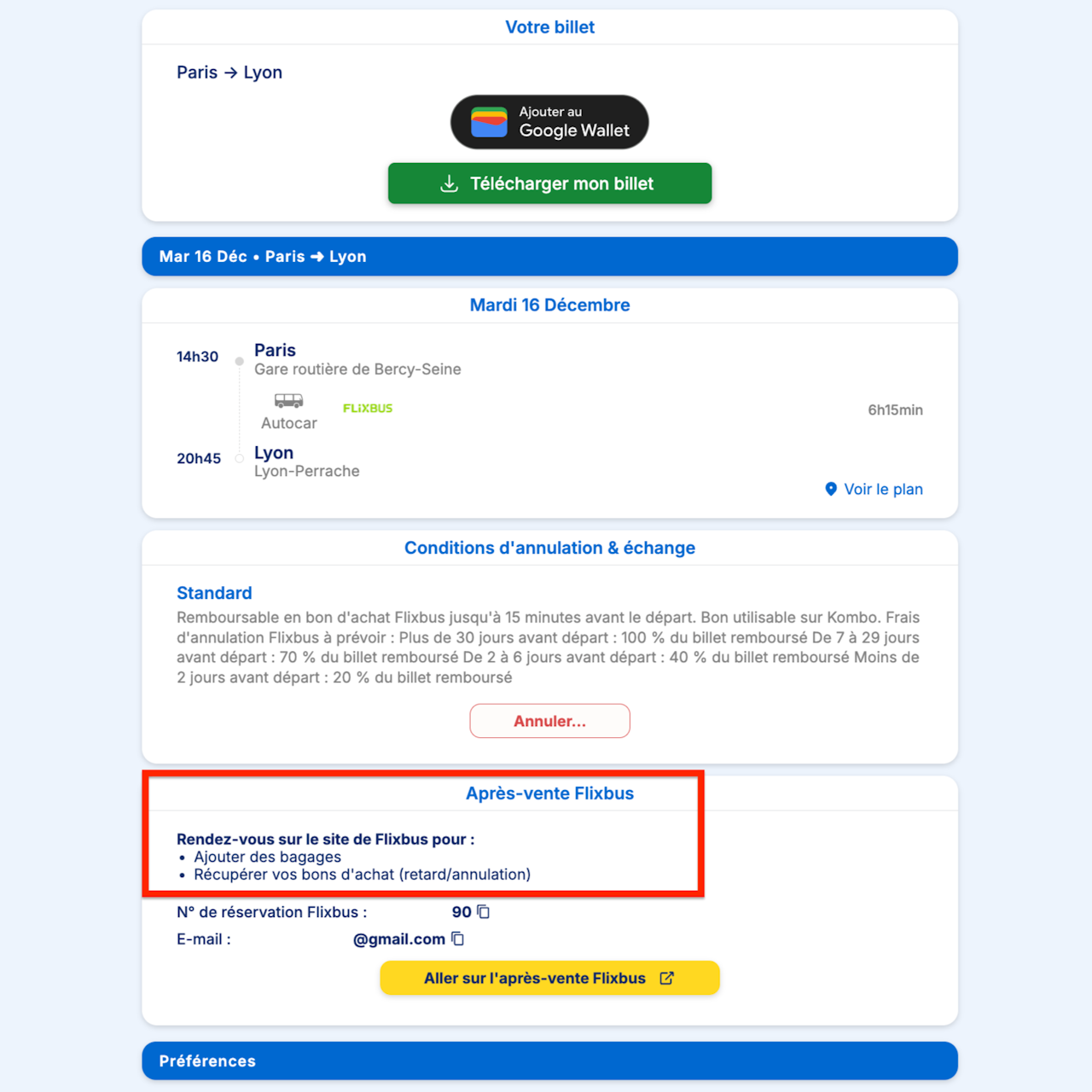 🚌 Certains bus sont échangeables comme les Flixbus, pour modifier vos billets il suffit de vous rendre sur votre espace après-vente grâce aux informations que nous vous donnons, puis cliquer sur "Modifier la date et l'heure de départ". Attention, cela dépend des conditions de votre billet mais aussi de la compagnie.
