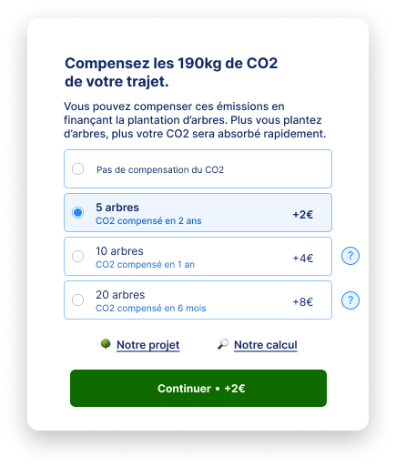 D'autre part, grâce à notre programme de compensation volontaire, disponible sur tous les billets d'avion que nous vendons. Pour chaque réservation consultée, nous vous informons des émissions de CO2 reliées aux trajets que vous réservez, et vous permettons de les compenser en 1 an maximum, grâce à Tree Nation, notre association partenaire en charge de planter vos arbres au Népal.